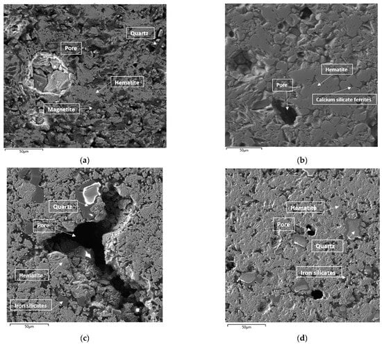The XRD analysis of the tested pellets, in contrast with certified chemical analysis, indicates that the methodology was able to identify the major phases of iron oxides, namely hematite and magnetite, as well as SiO2 phases (quartz and cristobalite). Minor phases based on complex iron oxide compounds, CaO, and SiO2 (ferrites and silicates) were not identified due to their low detection limit. Some insight into the presence of individual phases was provided by the microstructural SEM EDX analysis.