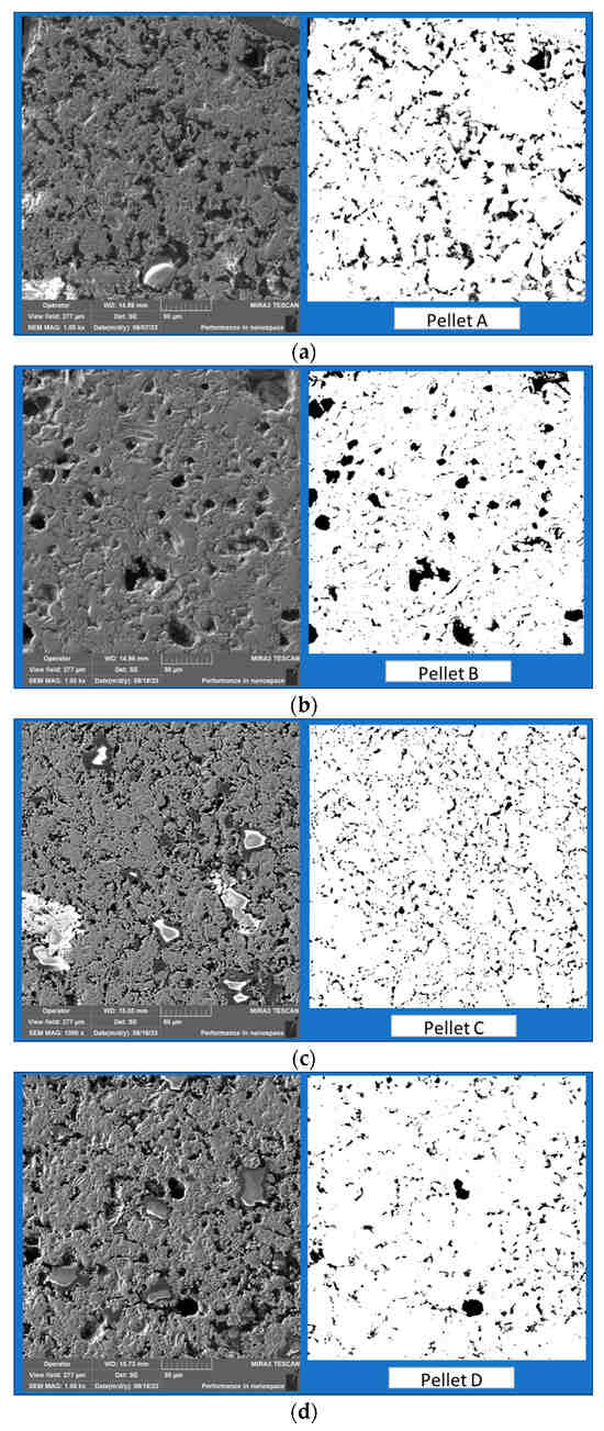 Image conversion of the microstructural images for porosity assessment (black areas on the image to the right). (a) Pellet A; (b) Pellet B; (c) Pellet C; (d) Pellet D.