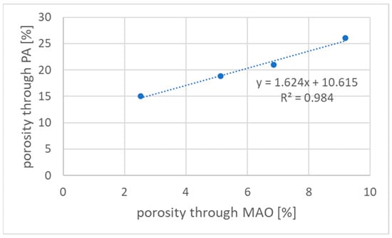 Correlation of pellet porosities. MAO—porosity based on microstructure; PA—calculation based on pycnometric and volumetric true density.