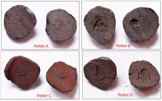 From the visual observation of the pellets (Table 4), we can track the macrostructure of the pellets, cracking, as well as various volumes within the diffusion mechanism of the reduction. The strength characteristics of the pellets after reduction were significantly reduced, which was evident during their division, where partial breakdown occurred. This reduced strength corresponds to the structural changes during the reduction, increased porosity, and weakening of the bonds due to phase transformations. Pellet A maintained its integrity, but the presence of surface cracks suggests internal changes in the material during reduction. After manual division, significant porosity and a layered structure were revealed, indicating oxygen loss during the reduction process. Pellet B exhibited smaller surface cracks and revealed a compact internal structure with irregularities upon division, indicating an inhomogeneous reduction process and internal stress developed during reduction. In the case of Pellet D, surface cracks indicated disruption of the internal structure, and after division, slight layering and porosity were observed, suggesting uniform reduction accompanied by microstructural changes. Pellet C retained its shape, but surface cracks revealed changes within the pellets. After division, significant porosity and layering were observed, which may be related to the faster release of gases during the reduction. In all samples, porosity and cracking were observed, which are a result of internal stresses and structural changes induced by the reduction process.