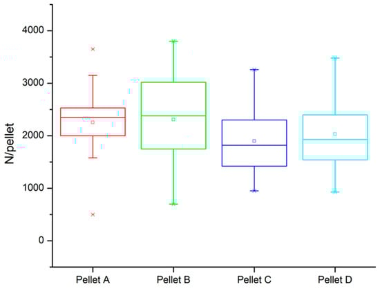 Figure 7 presents the compressive strengths of the pellets, showing that Pellet A has the highest average strength with a minimal range of measured strengths, whereas Pellet B exhibits a wide range of strengths, indicating a less homogeneous structure.