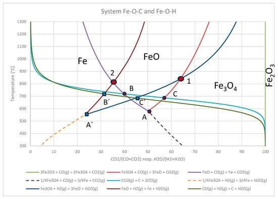 For the study of reduction conditions, the basic assumptions of the Fe-O-H system under H2–H2O conditions were used. For this purpose, a Baur–Glessner diagram (Figure 8) was constructed based on the thermodynamic data from HSC Chemistry. Figure 8 compares the carbothermic and hydrogen reduction of iron oxides.