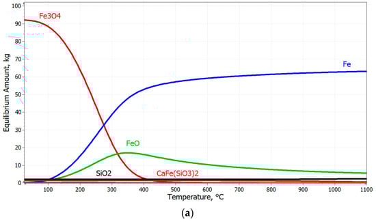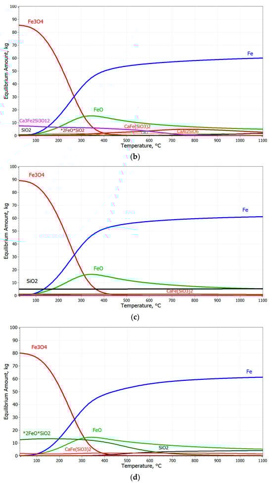 The equilibrium amount of the pellets changes under isothermal conditions with the amount of reducing agent, and the reduction process follows a logarithmic or power-law character, as shown in Figure 12c,d. In order to confirm the correctness of the thermodynamic simulations of the equilibria for the tested pellets, the equilibria for the reduction of pure hematite were simulated (Figure 12a,b), and these were compared with the stoichiometric calculation of the considered reduction of Fe2O3 in three steps to obtain iron.