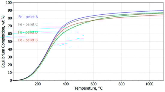 Comparison of Fe yield for the tested pellets in an H2 atmosphere—thermodynamic simulation.