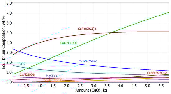 Equilibrium composition of calcium silicates with varying CaO content. Explanation: *2CaO*Fe2O3—standardized notation of a complex dicalcium ferrite (2CaO·Fe2O3) in the HSC Chemistry thermodynamic program.