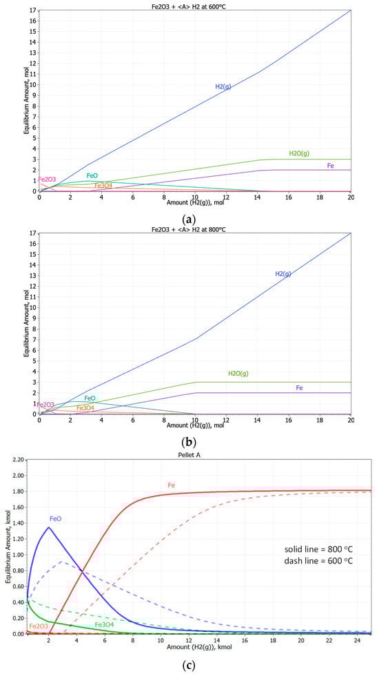 From Figure 12a,b, we see at first glance that for the reduction of 1 mole of Fe2O3 approximately 10 moles of H2 are required at 800 °C or approximately 14 moles of H2 at 600 °C. From the stoichiometric calculation of partial Equations (12)–(14) or their summary Equation (15), it follows that 3 moles or 67.2 L of H2 are consumed per 1 mole of Fe2O3. The calculated moles may initially appear to be in contradiction with the predicted graphs (Figure 12a,b). In fact, it is necessary to take into account the displayed line of hydrogen content in the graphs (blue curve “H2(g)”) and in the relevant section subtract it from the predicted H2 consumption, which is shown on the x-axis. In this way, not only is the correct consumption of the reducing agent determined, but also the exact equilibrium amounts of the components. For example, for the perpendicular section in Figure 12a on the x-axis at a value of 14 moles of H2, the value of the curve “H2(g)” is 11 moles, which gives the actual consumption of 14 − 11 = 3 moles. The intersections of the above perpendicular with the other lines further indicate the amount of Fe = 2 moles and H2O(g) = 3 moles, which corresponds to the state of completion of the reduction of 1 mole of hematite.
