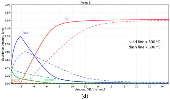 We observe the same differences in the so-called yield of reduced iron across the entire range of reducing agents for the individual pellet types (see Figure 12c,d). The observed differences in equilibrium composition are up to 10 wt.% within the compared commodities. The maximum Fe yield in Pellet A in an H2 atmosphere at 800 °C is 94% (at 600 °C, it is 93%). For Pellet B, the predicted Fe yield is 85% at 600 °C and 87% at 800 °C. The increase in temperature supports the reduction process, leading to a higher yield of metallic Fe.