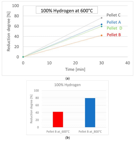 Hydrogen reduction indexes of pellets and the effect of temperature on the reduction degree: (a) 600 °C; (b) 800 °C.