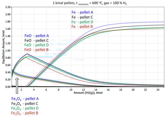 The reduction of the tested pellets, simulated under different ratios and amounts of reducing gases, was carried out based on the modeling of the reaction system. The prediction of pellet reduction for simulated conditions in an H2 atmosphere at a constant temperature was conducted based on the input chemical composition of the pellets and the stoichiometric calculation of their predicted mineralogical composition.