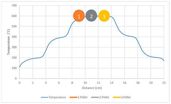 The results of the mathematical model, presented in Figure 15, illustrate the changes in the temperature field of the gas atmosphere in the heating zone of the ceramic tube, where the samples were placed during reduction at an isothermal temperature. The flow simulation focused only on the isothermal reduction phase and simulated the change in temperature of the gas phase flowing through the system. Figure 15 clearly shows that the flow of the reducing agent (H2) affects the temperature distribution near the pellets, cooling the area around the first pellet.