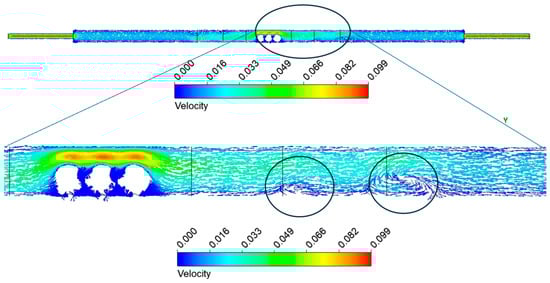 Figure 17 illustrates the distribution of the velocity field in the system. Due to the gas flow moving from the warmer zones to the cooler ones, accompanied by a change in gas density, vortex zones form behind the pellets. The turbulent area behind the three pellets can also affect the reduction effect, as it influences the residence time of the reactants and increases the diffusion of the reacting components.