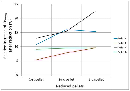 As part of the analysis, differences in reduction were also recorded and confirmed for the individual pellets placed in the furnace (pellets 1, 2, and 3) during hydrogen exposure (Figure 18). These differences confirm the effect of the reducing gas flow through the layer, which needs to be taken into account.