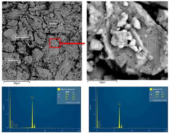 The observation of pellet samples using electron microscopy after reduction at 600 °C in a hydrogen atmosphere was carried out on four different types of pellets. Pellet B reduced at 800 °C was also analyzed separately. Electron microscopy on iron (Fe) pellets after hydrogen reduction was performed for several reasons. Using EDS (energy dispersive spectroscopy), it was possible to analyze the chemical composition of the samples and determine the presence of iron oxides and impurities, which is crucial for optimizing reduction processes. This method also allowed for the observation of phase changes that occur during the transition from iron oxides to metallic iron and enabled the analysis of their impact on the microstructure of the pellets. Additionally, it enabled the identification of porosity in the pellets after reduction, as this property influences their mechanical characteristics.