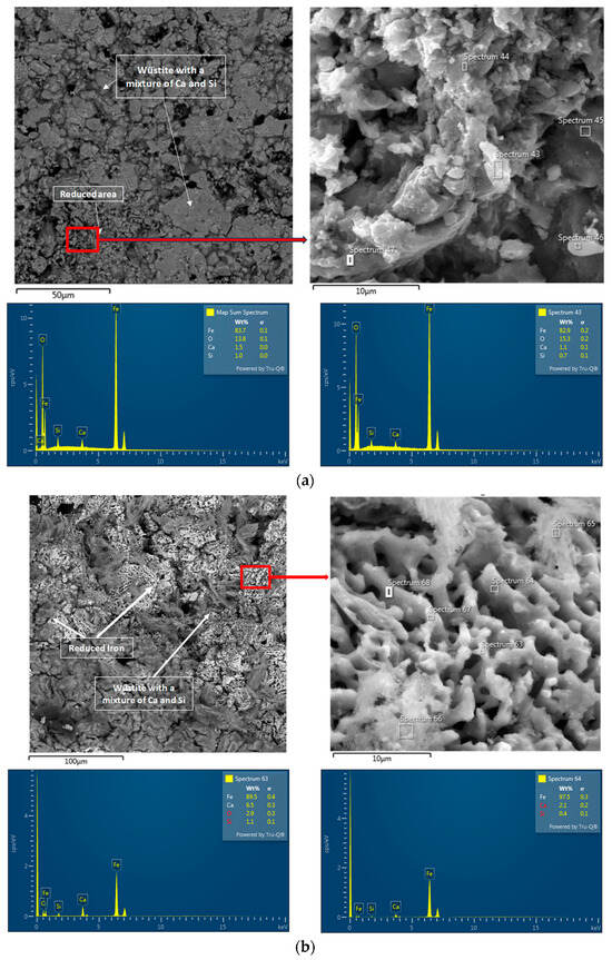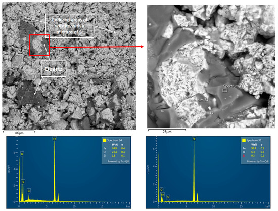 Pellet B, reduced at 600 °C, is characterized by the dominant presence of FeO with calcium and silicon impurities but also contains non-reduced areas (Figure 20). Its structure remains similar to the original sample but includes regions with a finer-grained structure, which are associated with the reduced zones. Pellet B after reduction at 800 °C in a hydrogen atmosphere shows the presence of FeO and Fe in the process of reduction to metallic iron and also contains impurities of silicon and calcium. These pellets are characterized by light areas with significantly increased porosity, which arise from the reduced oxides.