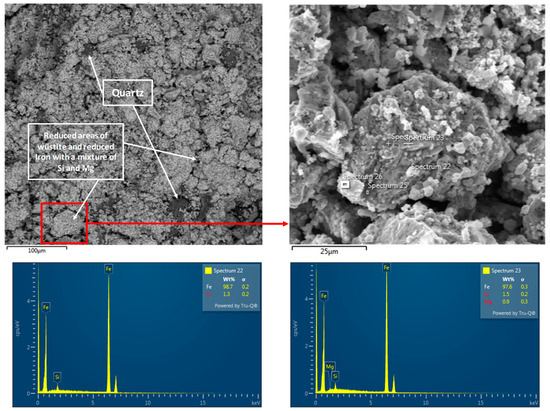 The pellet sample A after reduction contains iron oxide (FeO) and reduced iron (Figure 19). The structure of these pellets shows changes in the morphology and shape of the grains compared to the original sample. Small formations based on reduced iron can be found in the structure.