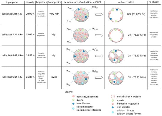 Schematic comparison of the reduction of iron ore pellets.