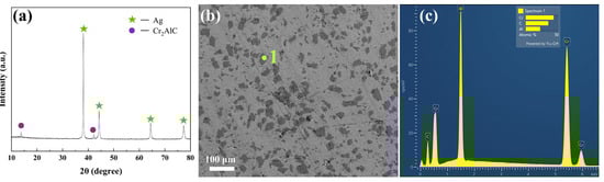 (a) X-ray diffraction (XRD), (b) scanning electron micrograph (SEM), (c) point-scanning results of Ag-Cr2AlC composite.