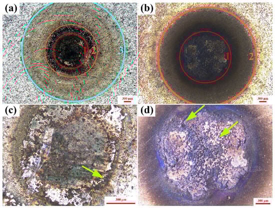 The Ag-Cr2AlC composites were subjected to one and 100 times of arc erosion at a load voltage of 7 kV, with the eroded morphology illustrated in Figure 3a and Figure 3b, respectively. As observed in Figure 3a, the eroded shape exhibits a rounded shape. Based on the varying colors following erosion, the eroded area can be categorized into three distinct regions: the eroded center area, the eroded edge area, and the heat-affected area, as depicted in Figure 3a. The eroded center area corresponds to the region within circle 1, while the eroded edge area is defined as the space enclosed between circle 1 and circle 2. The heat-affected area is located between circle 2 and circle 3. In Figure 3b, the same divisions are applied; however, due to the limited magnification of the device, the heat-affected zone is not depicted within the image. The software equipped with the 3D LSCM was utilized to measure the arc erosion area. The erosion area of Ag-Cr2AlC composites after one arc erosion is approximately 1.32 × 106 μm2, while the erosion area after 100 arc erosions is approximately 3.84 × 106 μm2. A comparison of Figure 3a,b reveals that, after 100 times of arc erosion, the eroded center area is significantly larger than that observed after a single erosion. This trend is also evident in both the eroded edge area and the heat-affected area. The morphology of the eroded center area is further enlarged in Figure 3c and Figure 3d, respectively. The morphology appears relatively flat, with only the edge of the eroded center exhibiting a morphology of protrusion, as shown by arrow in Figure 3c. Conversely, Figure 3d displays a topography characterized by numerous protrusions, as indicated by the arrows.
