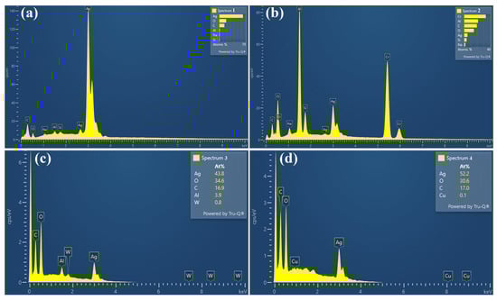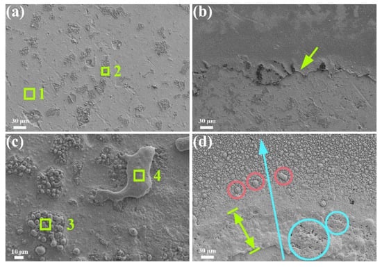 The micrographs of the surface of Ag-Cr2AlC composites after one and 100 times of arc erosion are shown in Figure 4a,b and Figure 4c,d, respectively. In Figure 4a, the eroded morphology is relatively flat, and basically the distribution of the matrix and reinforcement phases can be recognized. The eroded edges are narrower, as indicated by the arrows in Figure 4b. The materials in rectangles 1 and 2 were analyzed through EDS, as shown in Figure 5a,b. From Figure 5a, it is evident that rectangle 1 primarily contains the elements Ag and O, along with a minor presence of Al. Meanwhile, rectangle 2 predominantly consists of the elements Cr, Al, and C, with a small amount of Ag. This suggests that after one arc erosion, only a limited quantity of Ag oxidized on the surface, and only a small fraction of the Cr2AlC phase decomposed. Small amounts of elemental Si and Na were also detected in both EDS results, which may be impurities left over from polishing and cleaning. After 100 times of arc erosion, the eroded center area depicted in the local magnification of Figure 4c, material melting and solidification can be observed. Focusing on the eroded edge area, it is observed that the width of the edge is greater than that observed after one time of arc erosion, measuring over 100 µm. There are many spatter particles of different sizes outside the eroded edge area, as the area shown by the red circle in Figure 4d, where the spatter particles are larger. From the eroded center towards the edge, the particle size gradually becomes smaller, as indicated by the blue arrow in Figure 4d. The eroded edge exhibits distinct morphological characteristics of material melting and re-solidifying, while numerous holes are formed, as illustrated by the blue circle in Figure 4d. Point-scanning of the material at rectangles 3 and 4 were conducted, and the results are presented in Figure 5c,d. Elemental analysis revealed that Ag, O, and C were predominantly detected at rectangle 3, along with trace amounts of Al and W. In comparison to the results from one arc erosion, these findings indicate that a significant quantity of molten Ag was sputtered onto the surface of the material, while W elements from the anode were deposited onto the surface of the cathode following 100 cycles of arc erosions. At rectangle 4, the elements Ag, O, and C were primarily examined. The morphology observed at this location is a result of the melting and re-solidification of metallic silver. Spectroscopic analysis reveals that the Ag-Cr2AlC composites exhibit oxides on their surface, and Cr2AlC decomposed following both 1 and 100 arc erosions. After 100 cycles of erosion, the melted silver was subjected to arc forces, resulting in the sputtering of particles of varying sizes. The splashed/sputtered Ag particles observed after 100 arc erosions could indeed contribute to the formation of conductive debris, which may have significant implications for the electrical performance of the contact material. Conductive debris could potentially lead to short circuits, increased contact resistance, or even arc reignition under certain conditions. We suggest that future studies could explore surface modifications or protective coatings to minimize the splashing of Ag particles and reduce debris formation. In Figure 4, traces of material melting and re-solidification are evident. Additionally, Figure 3 shows that the eroded area resulting from 100 arc erosions is significantly larger than that from a single arc burn. Moreover, after one arc erosion, as depicted in Figure 4, the amount of material ejected from the melt pool is minimal; conversely, after 100 arc erosions, a substantial number of particles are observed to be splashing.
