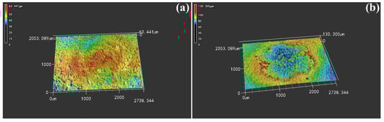 The 3D laser scan images following 1 and 100 arc erosions are presented in Figure 6. The color coordinates in this figure indicates height, with red representing a bump and blue indicating a depression. In Figure 6a, there is an absence of blue areas at the eroded center, suggesting that a single arc erosion does not produce a depression. Conversely, Figure 6b clearly shows that the eroded center is blue, while the edges are raised in red. This observation indicates that after multiple arc erosions, a concentrated eroded crater morphology has formed at the center, while the edges exhibit a raised morphology due to the arc force [18,19,20].