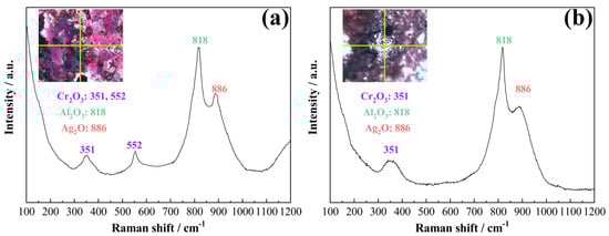 Raman spectroscopy was employed to analyze the composition of the eroded center area following 1 and 100 arc erosions. The laser light from the Raman spectrometer is directed at the green cross in the inset of Figure 7. Figure 7a presents the Raman spectrum of the Ag-Cr2AlC composite following one arc erosion, revealing the presence of Cr2O3 (R060892), Al2O3 (X050045), and Ag2O on the surface [21,22,23]. Figure 7b displays the Raman spectrum of the Ag-Cr2AlC composite after 100 arc erosions, where the same substances—Cr2O3, Al2O3, and Ag2O—are also detected on the surface. Combined with the energy spectrum results in Figure 1, these findings indicate that the Ag-Cr2AlC composite material experiences oxidation after both one and 100 arc erosions.