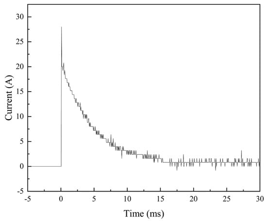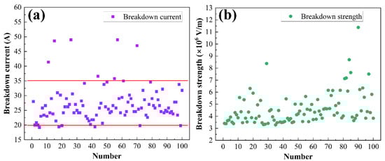 Under the action of the electric field, the original insulation of the air breakdown occurs, the current instantaneously reaches its maximum value, this maximum value is the breakdown current. Figure 8 shows the curve of current-time after one discharge. This time the breakdown current is 28 A. The breakdown currents for 100 discharges are recorded in Figure 9a. It is evident that when the loading voltage is set at 7 kV, the breakdown current values remain relatively stable, fluctuating between 20 A and 35 A.