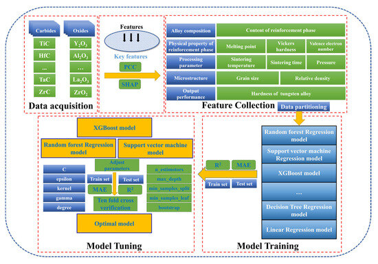 Machine learning method was utilized to predict the hardness of the dispersion-strengthened tungsten alloys featuring different carbides and oxides, and the illustration of the detailed process is presented in Figure 1.