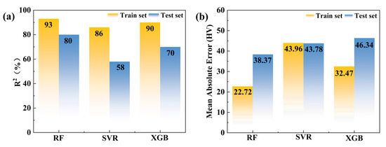 Different model metrics, R2 and MAE, were applied to evaluate the tuned models, and the results are shown in Figure 9. As shown in Figure 9a, the R2 values of the training and test sets for the RF model are 0.93 and 0.80, respectively. For the SVR model, they are 0.86 and 0.58, respectively. For the XGB model, they are 0.90 and 0.70, respectively. The discrepancy in the R2 values between the training and test sets may arise from the insufficient and scattered data of different carbides and oxides as the reinforcement phases obtained from previous studies. The RF model outperforms the SVR and XGB models in terms of R2 for both the training and test sets. As shown in Figure 9b, the MAE values of the training and test sets are 22.72 and 38.37 for the RF model, 43.96 and 43.78 for the SVR model, and 32.47 and 46.34 the XGB model. In the experimental measurement of the hardness of the dispersion-strengthened tungsten alloy, the error value of the hardness for several tests on the same sample is usually several tens of HV. Therefore, the errors for all models are within the expected range. In summary, the RF model is superior to the SVR and XGB model and is the optimal model.