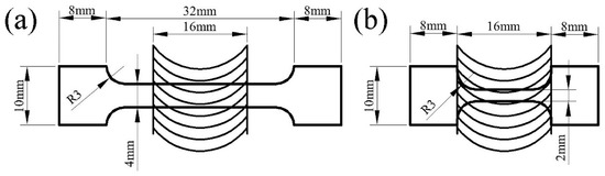 The microstructures of the transverse plane of the joints with and without DCT were characterized using a Leica DM4000M optical microscope (OM) produced in Leica Microsystems, Wetzlar, Germany, and a Zeiss/Auriga scanning electron microscope (SEM) equipped with an electron backscatter diffraction (EBSD) system. During EBSD measurement, the scanning step size of the electron beam was 0.15~0.3 μm at an accelerated voltage of 15 kV. The OM and SEM samples were ground, polished with sand papers, and then etched in a 4% Nital solution for 5 s. The samples for EBSD analysis were mechanically polished and then electro-polished using a solution of HClO4:CH3CH2OH = 1:9 (vol.%) at 20 V for 10 s at room temperature. The average grain size was statistically calculated using Nano-measure software Ver.1.2.5 based on the EBSD results and linear intercept method. According to the ASTM E92-23-Standard [28], the microhardness was measured along the transverse plane of the joints using an HXD-1000TMC machine (Sunny hengping instrument, Shanghai, China) with an applied load of 1.96 N, an interval of 200 μm, and a dwell time of 10 s. Both the uniaxial global and miniature tensile specimens were wire cut perpendicular to the welding direction. The gauge dimensions of the tensile specimens are shown in Figure 1. The tensile test was carried out on the AG-50kNIC electronic universal test machine (Shimadzu Co., Kyoto, Japan) according to the ASTM E8/E8M standard [29]. The initial strain rate in Figure 1a was 1 × 10−3 s−1, and in Figure 1b, 0.5 × 10−3 s−1. For accuracy, at least three tensile tests were performed for each specimen with the same welding parameters.