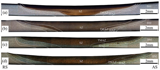 Overview of the transverse cross-section of the joints made at different rotation speeds (a) 200 rpm; (b) 300 rpm; (c) 400 rpm; (d) 500 rpm.