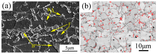 Figure 4a shows the SEM microstructure of the BM, which was composed of bainite, ferrite, and RA. Figure 4b shows the EBSD image quality (IQ) map of the BM, in which RA was denoted with a red color. RA was found to be generally distributed at the grain boundaries. RA had an average grain size of 0.7 μm and volume fraction of 4.2%, while the grain size of the ferrite matrix had an average grain size of 6.19 μm.