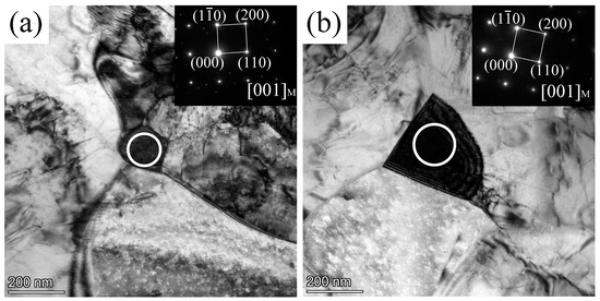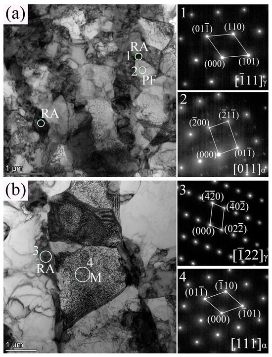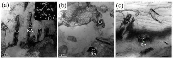 Figure 5 shows the TEM images of the BM. In Figure 5a, RA was distributed both within the interior and along the grain boundaries of ferrites. The width of the RA was less than 1 μm, with lengths ranging from 1 to 4 μm. As shown in Figure 5b, RA was distributed on the grain boundaries of the ferrite. Additionally, the diameter of the RA was less than 2 μm. Figure 5c shows that RA, measuring less than 1 μm, was mainly distributed on the grain boundaries of the ferrite.