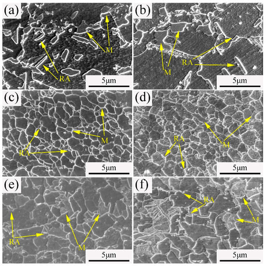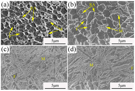 Figure 6 shows the SEM images of the microstructure of the SZ in the FSW joints produced under different welding conditions. Due to the different peak temperature and cooling rate, different final microstructures were formed in the SZ. As shown in Figure 6a,b, the microstructure of both 200 and 300 rpm joint SZs consisted of martensite, ferrite, and RA. The grain structure was obviously refined compared with that of the BM due to the relatively lower peak temperature during welding. Compared to the 300 rpm joint SZ, the average grain size was smaller, and the amount of martensite was less for the 200 rpm sample. For both 200 rpm and 300 rpm samples, the peak welding temperature in the SZ was between Ac1 and Ac3. As shown in Figure 6c,d, the microstructures of the joint SZs of the 400 and 500 rpm samples consisted almost entirely of martensite, together with a small amount of ferrite phase. The size of the martensite became much coarser because the peak temperature was supposed to be higher than the Ac3 point and FSW was completed above the austenitizing temperature.