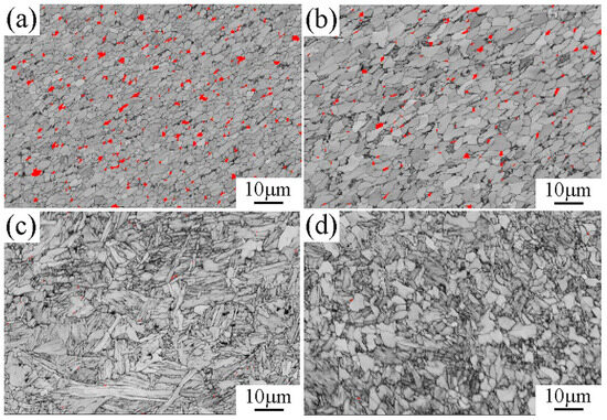 EBSD image-quality map showing the distribution of RA in the SZ. (a) 200 rpm; (b) 300 rpm; (c) 400 rpm; and (d) 500 rpm.