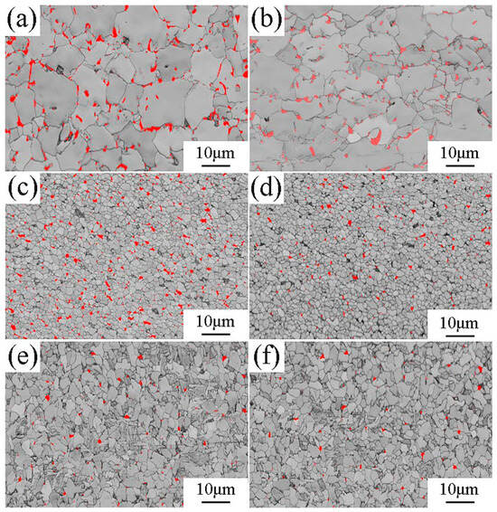 Figure 7 shows the distribution of RA in the SZ of the joints prepared with different rotation speeds, in which the areas with a red color were denoted as the RA. For the 200 and 300 rpm samples, austenite was partially formed during FSW and transformed into martensite after cooling. In addition, the SZ had a finer grain structure at a low rotation speed and therefore higher stability of RA. Compared with the BM, the RA content decreased slightly to about 3.3% for the 200 rpm sample and 2.2% for the 300 rpm sample, respectively. The content of RA was lower in the 300 rpm joint due to the larger size of the austenite, which compromised its stability [30].