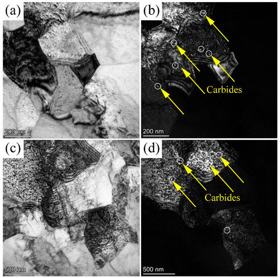 Figure 11a and Figure 11b show the bright field TEM image of the SZ of the 200 rpm joint after DCT for 24 h and 48 h, respectively. The martensite denoted with the white circles in the figure can be identified according to the inserted SAED patterns. Because the martensite was located at the grain boundaries and its size was about 200 nm, it could be determined that it was transformed from RA by the DCT. Figure 12a,b and Figure 12c,d show the bright field and dark field images of the SZ of the 200 rpm joint after DCT for 24 h and 48 h, respectively. It showed that DCT promoted the precipitation of fine carbides, and that the number of carbides increased with the increase in DCT time.