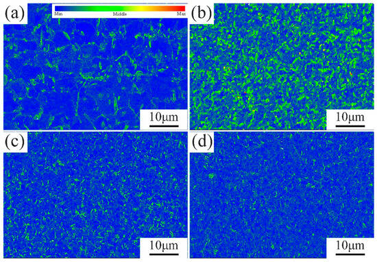 Figure 13 shows the kernel average misorientation (KAM) distribution maps of the BM and the 200 rpm joint’s SZ before and after DCT. KAM reflects the homogenization degree of plastic deformation. Where the KAM value is high, it means that the degree of plastic deformation is large or the defect density is high. When the rotation speed was 200 rpm, the SZ experienced severe thermoplastic deformation, and dynamic recrystallization and a high density of dislocations were formed. As shown in Figure 13b, the proportion of the deformation area was high and evenly distributed. DCT can promote the release of local stress, and the local stress was smaller with the increase in DCT time, as shown in Figure 13c,d.