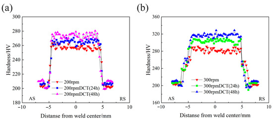 Microhardness variation on the center of the cross-section of joints treated after DCT. (a) 200 rpm; and (b) 300 rpm joints before and after DCT.