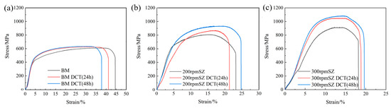Tensile stress-strain curves of (a) BM; (b) 200 rpm; and (c) 300 rpm joint SZ after DCT with various time.
