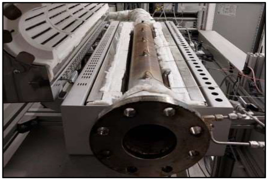 The torrefaction process was conducted using a Gradient Tube Furnace (Carbolite Gero, Bubsheim,,Germany) tube furnace equipped with a removable trough in the working tube. Sensors were placed on the working tube to monitor the temperature in each chamber (Figure 1). The samples underwent torrefaction at three different temperatures: 250 °C, 350 °C and 400 °C. The torrefaction was performed in a nitrogen atmosphere (N2, 3 L/min). The inlet gas was preheated to 50 °C. The duration of torrefaction under N2 atmosphere was determined based on the initial gas composition, whereas during the torrefaction process, gases are produced, and their concentration was analyzed with an ABB AO2020 gas analyzer (ABB, Zurich, Switzerland). The volume fractions of CO2, CO, CH4, and oxygen were measured. A cooled impinger train was installed upstream of the gas analyzer to ensure that the gas remains tar-free and dry.