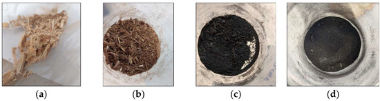 Torrefaction of wood material was performed in the N2 atmosphere at temperatures of 250 °C, 350 °C, and 400 °C. The samples are seen in Figure 2. As the temperature increased, the color of torrefied material changed from light to dark, reflecting alternations in its chemical composition. Several chemical reactions occurred during torrefaction, including the degradation of the cellulose, hemicellulose, oxidation, and reduction processes of lignin, and the enzymatically controlled Maillard reaction [13]. The interaction between proteins and polysaccharides through the Maillard reaction can alter the structure of proteins and enhance the functional properties of the material. The oxidative reaction of extracts in wood contributed to the darkening of the material, indicating the progression of carbonization on the wood’s surface.