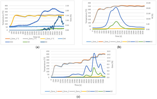 Gas analyses of wood material in N2 atmosphere with 3 L/min flow at the following temperatures: (a) 250 °C; (b) 350 °C; (c) 400 °C.