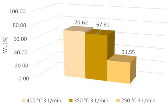 The results of mass loss (WL) at 250 °C, 350 °C, and 400 °C are shown in Figure 4.