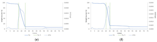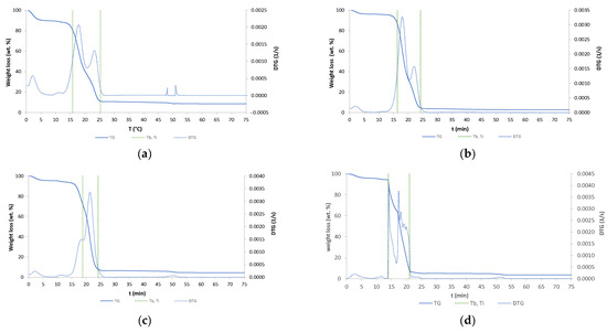 Thermogravimetric (TGA) and derivative thermogravimetric (DTG) analyses were performed. The TGA/DTG measurements were performed using Mettler Toledo TGA/DSC3+ (Mettler Toledo, Ljubljana, Slovenia) in oxygen atmosphere. The measurement was set as follows: the sample was heated from 30 °C to 105 °C with 20 K/min rate, then the heating was at a constant temperature of 105 °C for 5 min. Then, the temperature increased from 105 °C to 550 °C at 25 K/min rate. At 550 °C, the sample was heated for 20 min. Finally, the temperature was increased to 815 °C, and the sample was heated for 20 min at 25 K/min rate.