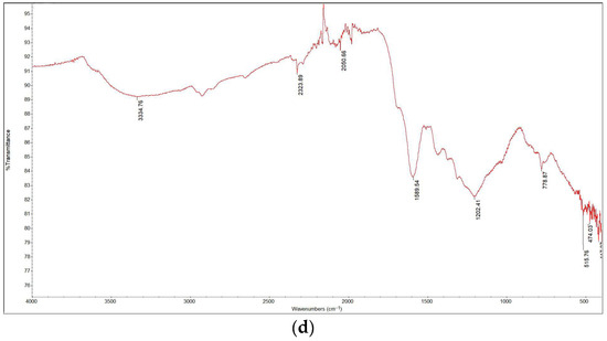 The FTIR spectra are presented in Figure 6. The spectrum of the sample torrefied at 250 °C closely resembled that of the raw biomass, as expected given that this was the lowest torrefaction temperature. The spectra for the samples containing Cu(II) and Ni(II) were also similar; by comparing the data with literature sources [2], various functional groups in the torrefied samples were identified. Functional groups such as O–H, C–H, and N–H were detected in all samples within the wavelength range of 2920 cm−1 to 3350 cm−1. Around 2300 cm−1, C≡O, C≡N, and X=C=Y bonds (where X and Y represent C, O, N, or S) appeared in all samples except for raw wood and wood torrefied at 250 °C. This suggests that torrefaction temperature significantly influences the presence of certain functional groups. Additionally, C=C, C–O (alcohols, esters, ethers, carboxylic acids), and C–N (amines) groups were detected in all samples within the 1175 cm−1 to 1615 cm−1 range. A prominent C–O band at 1022 cm−1, which is associated with cellulose and hemicellulose, showed decreasing intensity with increasing torrefaction temperature. These findings align with those of other studies [16,17].