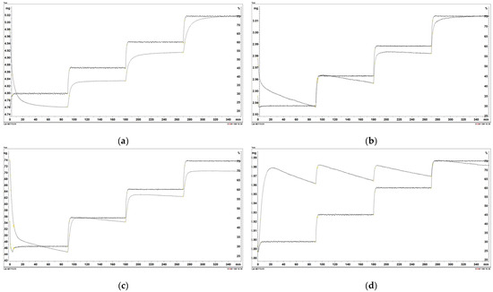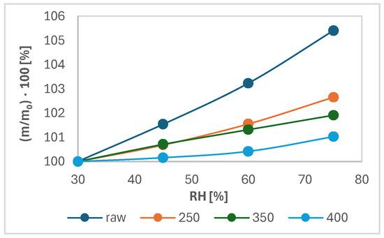 Figure 7 shows the changes in sample mass as a function of time and relative moisture of the atmosphere. Figure 8 shows the increase in the shared mass ratio because of moisture adsorption as a function of relative humidity (RH). As seen from Figure 7, the percentage of mass increase was the highest in all points of relative humidity and the lowest with wood torrefied at 400 °C. The highest difference in percentage of mass was detected between the initial and final weight for raw wood. The value was determined at 5.4%. The difference between the initial and final mass for samples decreased with increased temperature. The lowest difference in the percentage of mass increase between the initial and final mass was found in wood torrefied at 400 °C, determined at 1.0%. The results are in agreement with the theoretical foundations of torrefaction, which claimed the hydrophobicity of biomass increased with the torrefaction temperature and, therefore, became more resistant to moisture adsorption [8].