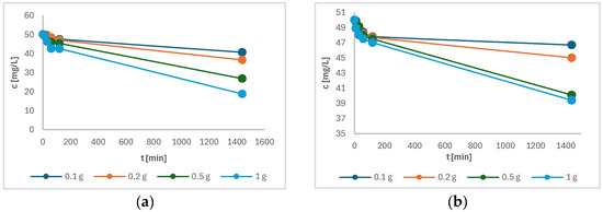 Figure 9 shows the variation of the concentration of the samples a) of Cu(II) and b) of Ni(II) as a function of time. The initial concentration of all solutions was 50 mg/L Cu(II) (or Ni(II)), and a decrease in concentration can be clearly seen in Figure 9a,b, indicating the successful adsorption of Cu(II) and Ni(II) onto the torrefied biomass. It was observed that Cu(II) showed a better adsorption affinity on torrefied wood than Ni(II). The adsorption for Cu(II) was higher, possibly because of strong coordination bonds formed with carboxyl groups [23]. In addition, it was observed that the sample with the highest initial mass of torrefied wood reached the highest metal adsorption onto torrefied material after 24 h of adsorption. The increment in uptake of both metals can be attributed to the constant mass transfer to the available active sites [24]. From Figure 9, it seems that the adsorption equilibrium was not reached. Therefore, the time was prolonged to 48 h. The measurement of the final concentration of both metal ions showed that the concentration did not change much compared to measurement after 24 h and sustained a plateau. Thus, it can be concluded that equilibrium was reached after 24 h.
