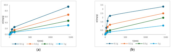 Figure 10 shows the change in adsorption capacity as a function of time. The adsorption capacity of each sample increases with time, whereby the sample with the lowest mass of charcoal has the highest adsorption capacity. Figure 10 shows that samples had not yet reached equilibrium after 24 h of adsorption, suggesting that our samples require significantly more time to reach a steady state [25]. The adsorption rate is influenced by the interaction of adsorption sites on the adsorbent surface. However, subsequent measurements showed only a negligible increase in capacity after 48 h.