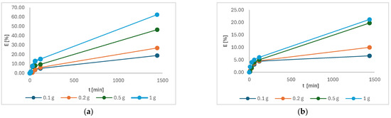 Figure 12 showed the highest efficiency of Cu(II) and Ni(II) was achieved in solution where the highest mass of 1 g of torrefied material was studied. In the case of Cu(II), the efficiency was 62.4%, and for Ni(II), it was 21.2%. It was expected and is in accordance with other studies [4,5]. The efficiency was higher in Cu(II) compared to Ni(II), probably due to the smaller size of Cu(II), which may promote affinity reactions [27].