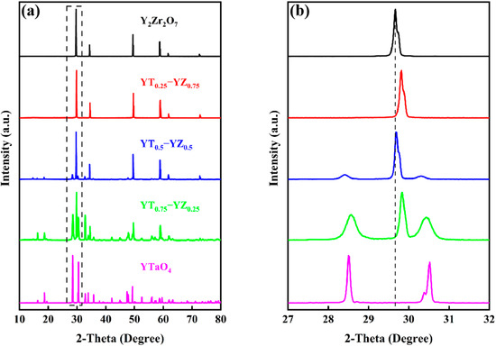 (a) X-ray diffraction (XRD) patterns of YT1−x–YZx (x = 0, 0.25, 0.5, 0.75, 1) composite ceramics; (b) the corresponding magnified diffraction patterns (27° ≤ 2-Theta ≤ 32°).